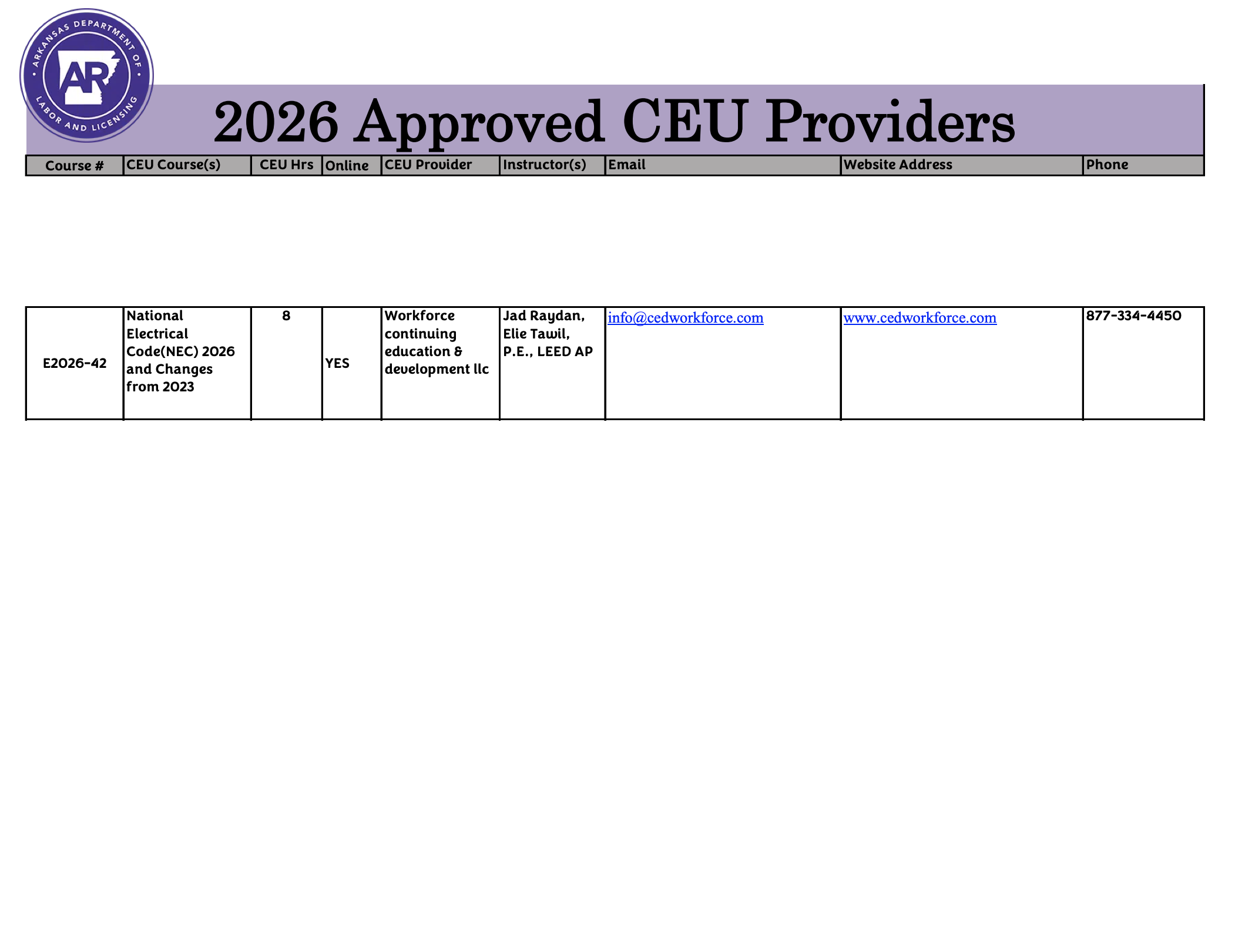 CEDworkforce.com is approved by the State of Arkansas Board of Electrical Examiners to offer continuing education courses to licensed Arkansas Master and Journeyman Electricians.