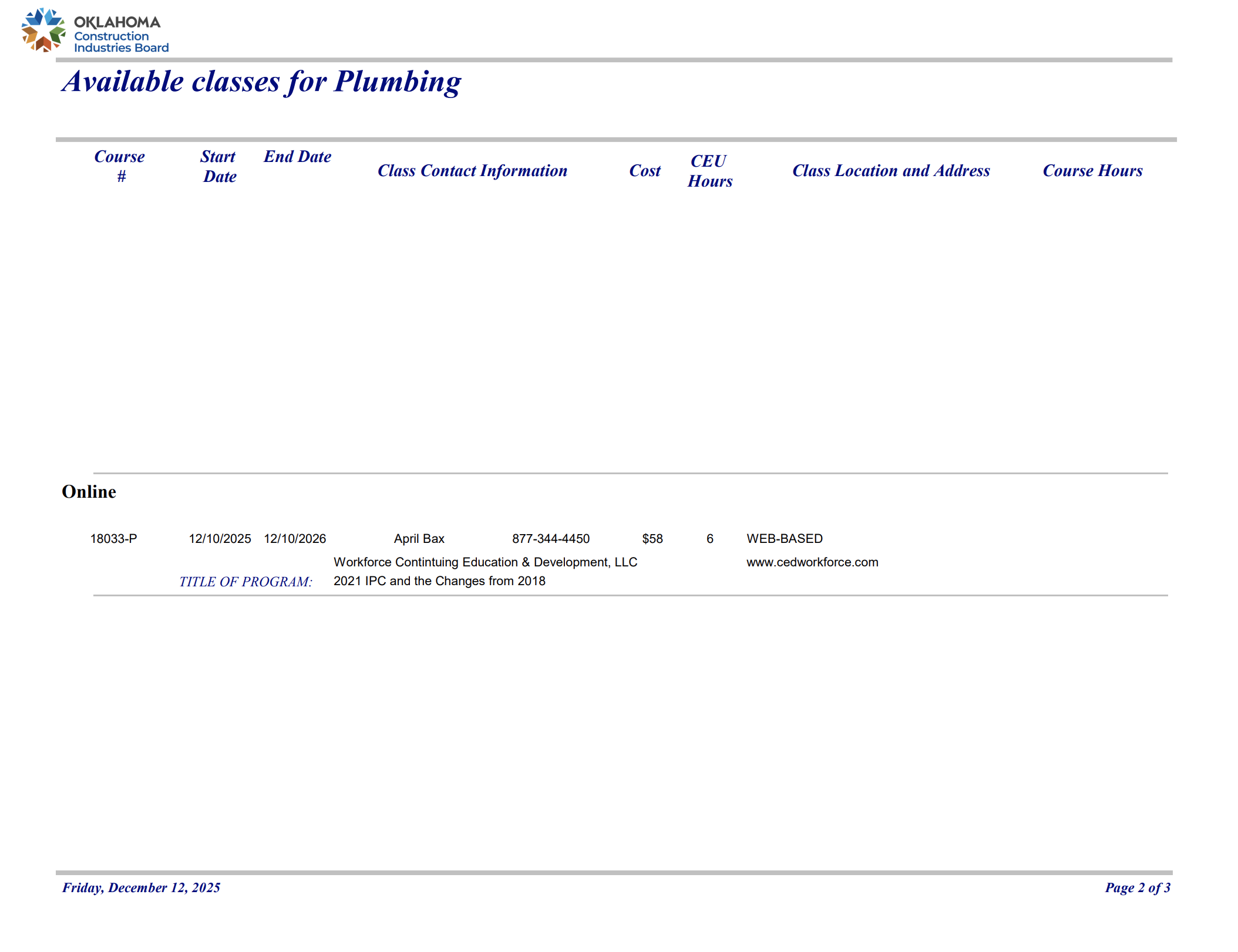 CEDworkforce.com is approved by the State of Oklahoma Construction Industries Board to offer continuing education courses to licensed Oklahoma Plumbing Contractors and Plumbing Journeymen.